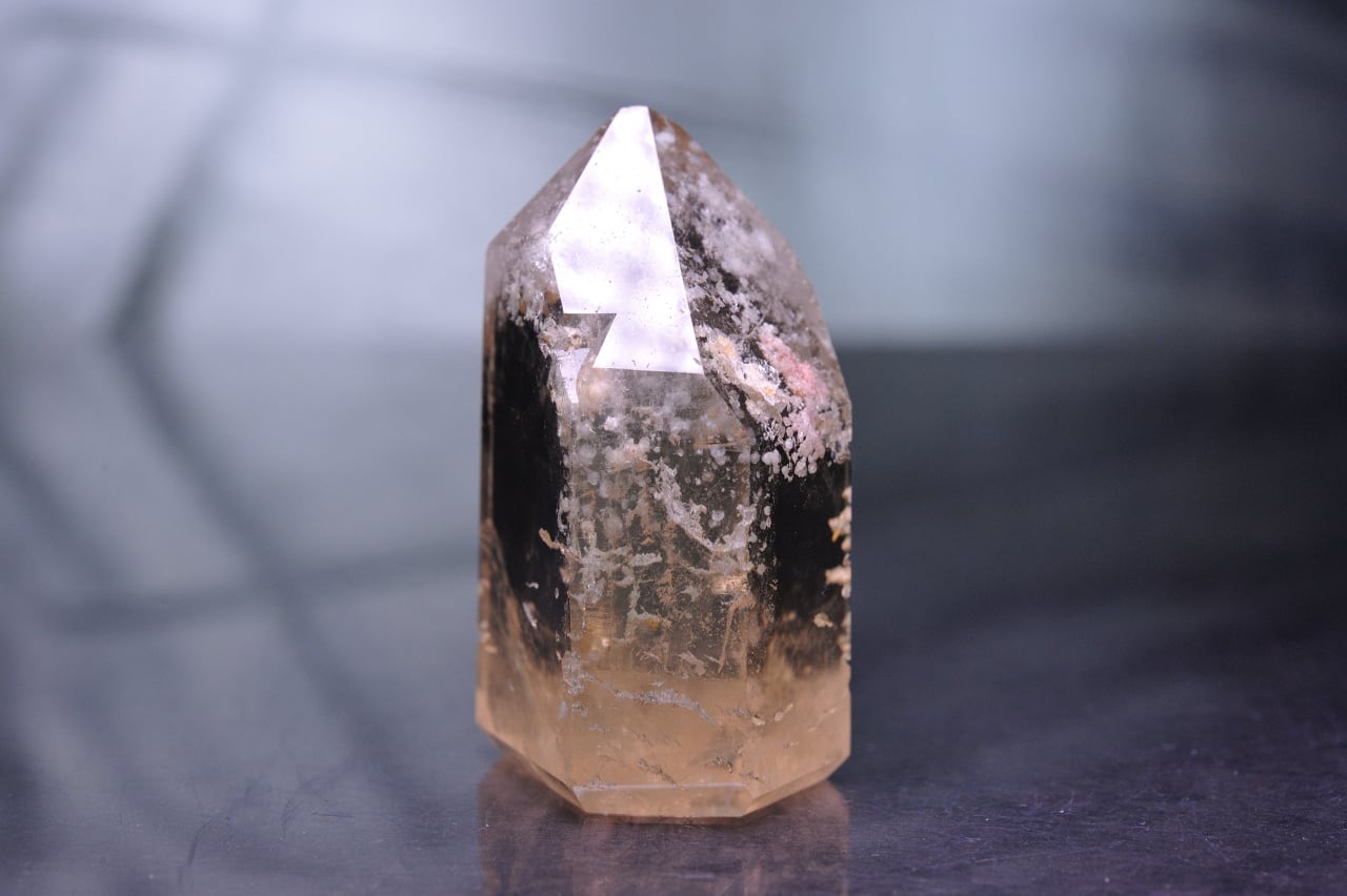ポリッシュをかけていない天然のままの部分(面)には、水晶の成長線である条線がびっしりと刻み込まれています。