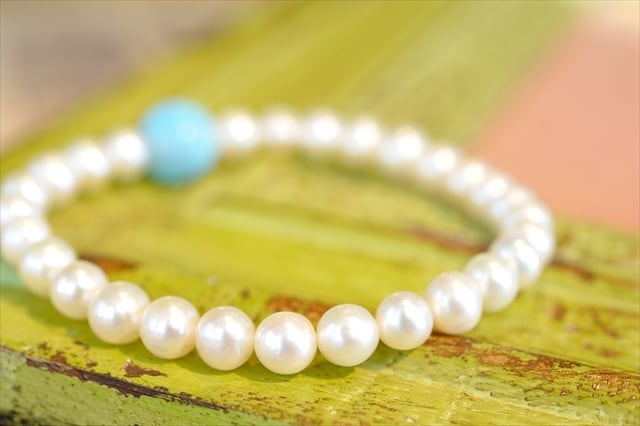 カリブの宝石ラリマーと純白の淡水パールを組み合わせたブレスレット。