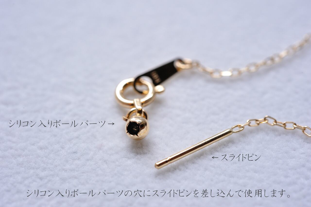 シリコン入りボールパーツをお好きな位置で固定しておくことができるので、チェーンの全長より短い範囲でサイズ調節が可能なのもうれしいポイントです。